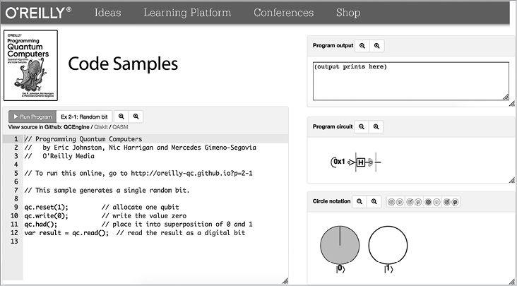 Существует много разных библиотек, систем и средств моделирования QPU. Список ссылок на некоторые системы с хорошей поддержкой доступен по адресу http://oreilly-qc.github.io. На этой странице мы приводим примеры кода из книги там, где это возможно, на разных языках. Но чтобы примеры кода не забивали текст, мы приводим примеры только на JavaScript для QCEngine. QCEngine — бесплатная сетевая система моделирования квантовых вычислений, которая позволяет запускать примеры прямо в браузере, без установки какого-либо программного обеспечения. Эта система моделирования была разработана авторами: сначала для личного применения, затем как приложение к книге. Система QCEngine особенно полезна для нас по двум причинам: во-первых, она может работать без загрузки дополнительного кода и, во-вторых, в нее интегрирована система круговых обозначений, которая будет использоваться как средство визуализации в книге.