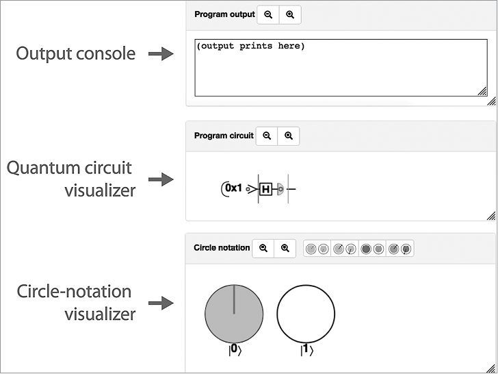 • Визуализатор круговых обозначений (Circle-notationvisualizer) — визуализация так называемой «круговой записи» регистра QPU (или системы моделирования). В главе 2 мы объясним, как читать и использовать эту запись.