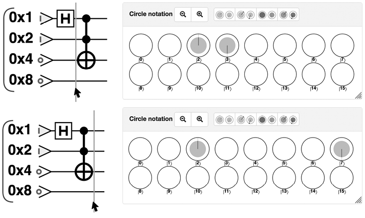 Отладка программ для QPU может быть весьма непростым делом. Нередко оказывается, что единственный способ понять, как работает программа, — медленно пройти ее в пошаговом режиме, анализируя визуализации на каждом шаге. Наведя указатель мыши на визуализатор схемы, вы увидите вертикальную оранжевую черту в фиксированной позиции и серую вертикальную черту в той точке схемы, в которой находится ваш курсор. Оранжевая черта обозначает позицию схемы (а следовательно, и программы), представленную визуализатором круговой записи. По умолчанию это конец программы, но, щелкая на других частях схемы, вы сможете просмотреть в визуализаторе круговой записи конфигурацию QPU в соответствующих точках программы. Например, на рис. 1.3 показано, как визуализатор круговой записи изменяется при переходе между двумя шагами программы QCEngine.