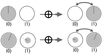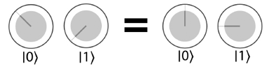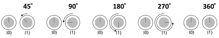 • относительная фаза между комплексными амплитудами этих значений, обозначается углом поворота круга | 1 〉 относительно круга | 0 〉 (темная линия в кругах делает величину поворота более наглядной).