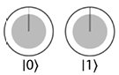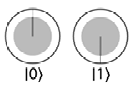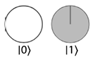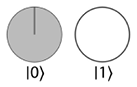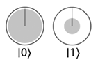• величина комплексной амплитуды, связанной с каждым значением, которое может принимать кубит (пока что это | 0 〉 и | 1 〉), описывается радиусом заполненной области, изображенной для каждого из кругов | 0 〉 и | 1 〉;