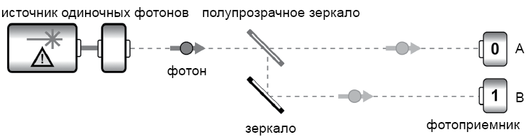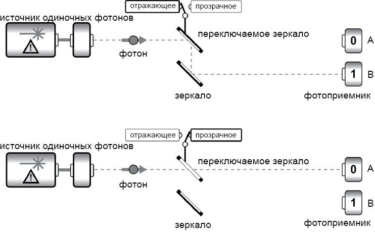Такие устройства действительно существуют в современных технологиях цифровых коммуникаций. Бит из одиночного фотона получится очень капризным (хотя бы потому, что он не способен подолгу находиться на одном месте). Чтобы использовать эту конфигурацию для демонстрации некоторых свойств кубитов, допустим, что переключатель, переводящий фотон в состояние 0 или 1, заменен полупрозрачным зеркалом.
