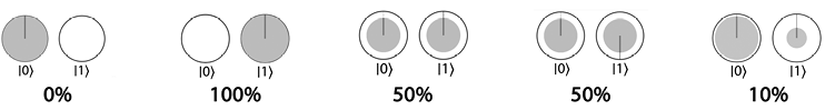 Ранее мы упоминали о том, что квадрат амплитуды, связанный с | 0 〉 или | 1 〉, определяет вероятность получения этого значения при чтении. Так как заполненный радиус в круге представляет амплитуду, это означает, что площадь заполненной области в каждом круге (или в разговорной речи — ее размер) прямо пропорциональна вероятности получить значение этого круга (0 или 1) при чтении кубита. В примерах на рис. 2.3 представлена круговая запись для различных состояний кубитов и вероятность чтения 1 в каждом случае.