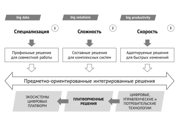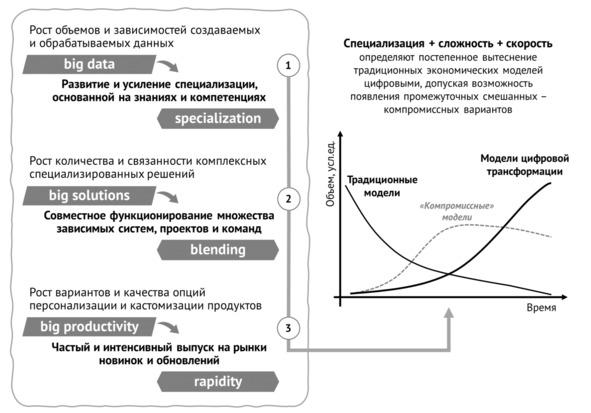 Три фактора обуславливающие мощные изменения в экономике, которая проходит цифровую трансформацию: специализация, сложность, скорость. Эта большая тройка полезна как объяснение значительно нарастающего количества информации, решений и продуктивности качественно переходящее в трансформацию внутренней и внешней среды бизнеса.