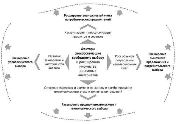 Пожалуй, одной из ключевых характерных особенностей тех изменений, что представляют собой цифровую экономику, является множественность выбора. Об этом исключительно важно помнить в связи с выработкой концепций, методов и технологий управления цифровой трансформацией. Свободный выбор из доступного множества вариантов фактически становится центральной идеей цифровой экономики, с легкостью овладевающей потребителями и целыми рынками. Факторы этому способствующие: