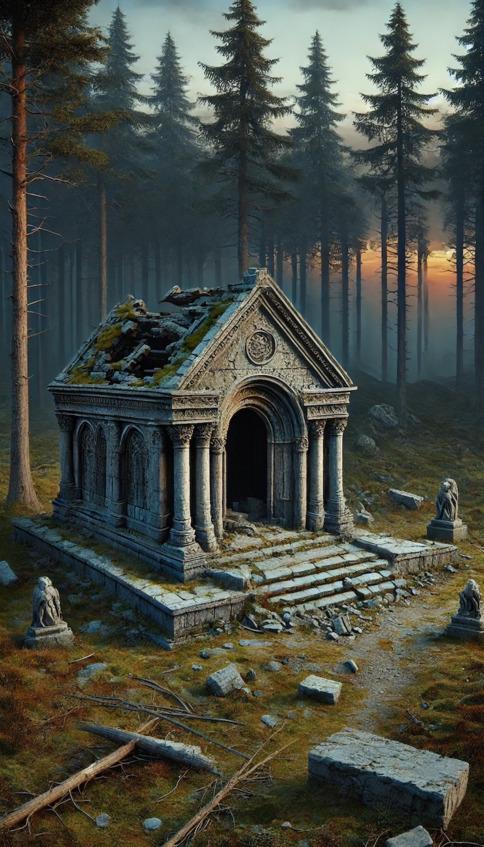 Пока Торм и Веик занимались лошадьми и разводили костер, я побродил среди руин. От камней веяло холодом и забвением. Я дотронулся до одного из них — он был шершавый и влажный. На уцелевшей стене я заметил выбитые в камне символы — скрещенные мечи, щиты с копьями, и фигуры воинов в доспехах. У входа валялись обломки статуи — видимо, когда-то здесь стоял сам Гурт в боевом облачении. Теперь его поверженное тело лежало в пыли, расколотое на куски.