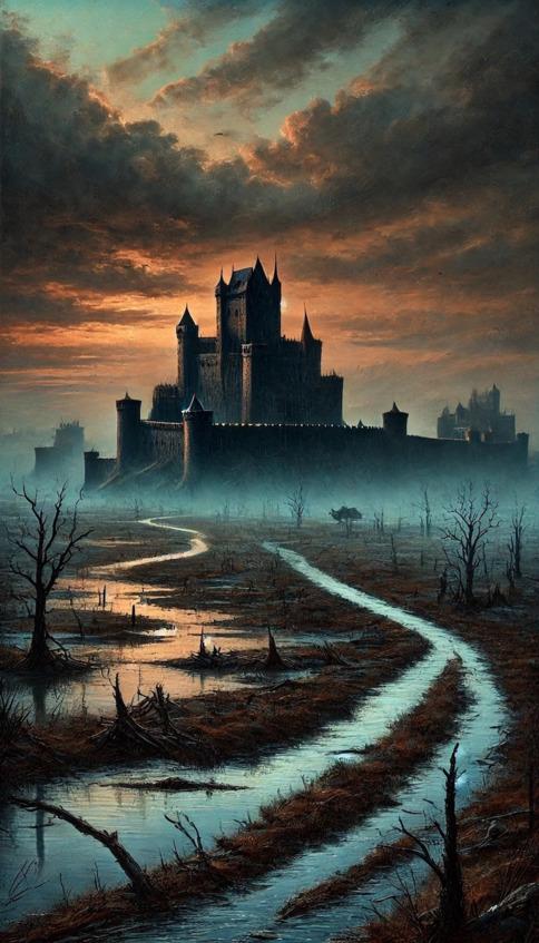 К вечеру дорога вывела нас на холм, и я увидел ее. Крепость. Она не стояла на скале — она вырастала из нее, как гигантский черный клык, впившийся в небо. Стены из влажного, блестящего камня казались не построенными, а проросшими прямо из болота. Высокие, слепые башни без флагов и знамен смотрели на мир узкими щелями бойниц, как глаза хищной рыбы. Вокруг на многие версты простирались топи, подернутые туманом, из которых торчали скелеты мертвых деревьев. От крепости веяло такой древней и глухой тоской, что у меня свело живот. Это было не убежище. Это была гробница.