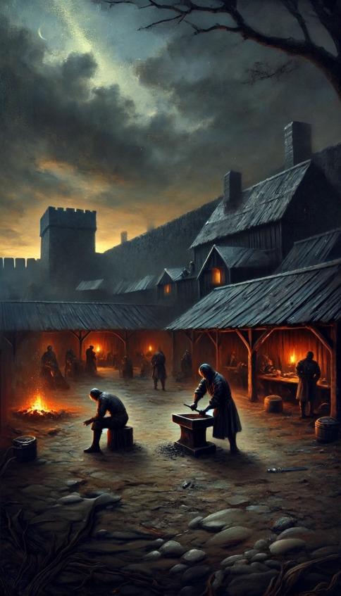 Мы въехали внутрь. За нами с тяжелым грохотом закрылись ворота, отрезая нас от внешнего мира. Я ожидал увидеть тихий, пустой двор, но вместо этого мы оказались в сердце бурлящего военного улья. Пространство было огромным, но не мощеным — лишь плотно утоптанная, влажная грязь, пахнущая сыростью и навозом. Повсюду горели костры, вокруг которых сидели солдаты. Вдоль стен тянулись грубо сколоченные навесы, под которыми сушилась чья-то одежда и стояли стойки, полные мечей, копий, топоров. В стороне виднелись большие, добротные конюшни, откуда доносилось лошадиное ржание.