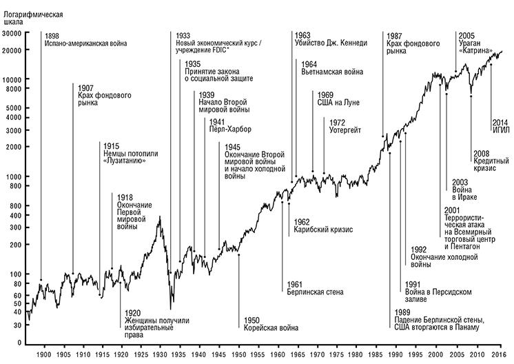 На каналах, где рассказывают о погоде, зрителей больше всего привлекают описания ураганов и смерчей. Однако бóльшую часть времени репортажи довольно скучны: переменная облачность, вероятность дождя 30 процентов, возможны грозы. В таких известиях нет ничего захватывающего для зрителей. Аналогичным образом обстоит дело и в мире финансовых новостей. Рынки то растут, то падают, компании выходят на биржу с первичным размещением акций — во всем этом нет ничего революционного. Чтобы придать новостям интерес, журналисты зачастую выдают самые заурядные истории об обычном падении котировок в течение дня за финансовый кризис, но это, как правило, практически никак не сказывается на долгосрочных тенденциях рынка. Вот почему мне так нравится график, представленный на рисунке 2.6. Как видите, на нем с трудом удается отыскать свободное место, куда можно впихнуть известия о различных «кризисах», происходивших начиная с 1896 года. А что же рынок? Ему до этого нет дела. Он продолжает покорять все новые высоты, щедро вознаграждая инвесторов, вкладывающих деньги на долгосрочной основе.