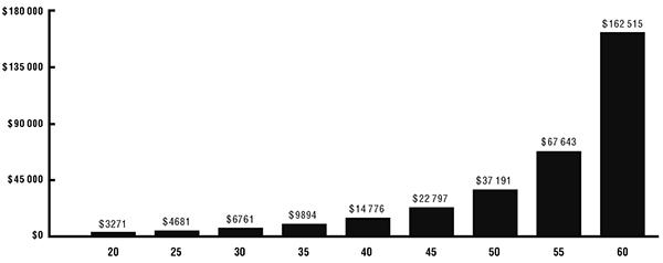 В книге «Переломный момент» Малкольм Гладуэлл пишет о некой «критической массе, пороге, точке кипения». И все это полностью применимо к накопительному эффекту сложных процентов. Вы хотите быть миллионером? Это реально, особенно если пораньше начать. Диаграмма, изображенная на рисунке 1.1, — это, пожалуй, самая важная диаграмма в вашей жизни (нечто похожее можно увидеть в большинстве книг, посвященных финансам). На ней показано количество денег, которые необходимо инвестировать каждый год, чтобы к 65 годам у вас накопился 1 миллион долларов. Мы исходим из доходности инвестиций 7 процентов годовых и вложения денег в инструменты с отсроченным налогообложением типа пенсионных накопительных программ 401(k) или IRA. Если вы начнете в 20 лет, то вам нужно откладывать всего 3271 доллар в год, или 272 доллара в месяц. Но если вы затянете с этим делом до 50 лет, то инвестировать придется уже 37 191 доллар в год, или 3099 долларов в месяц.