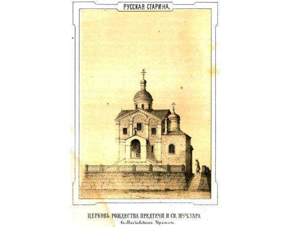 Отстроена в камне в 1461 г., снесена в 1847 г. по указанию Николая I. Считался первым московским храмом, изначально был освящен в честь Рождества Иоанна Предтечи. Был освящен заново (или только придел — по разным источникам) в честь святого мученика Уара после рождения царевича Дмитрия (младшего) в 1583 г. В ней под иконой св. Уара с частицами его мощей находился «женский» камень. [27]