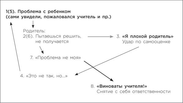 Давайте посмотрим, как, собственно, возникают разногласия между родителями и учителями, как растет недовольство между ними, каков механизм усиления напряженности. Предлагаю проанализировать пошагово, каким образом строится взаимодействие родителя с учителем. Это даст возможность многое прояснить, понять и далее найти направления и способы позитивного изменения ситуации (на Рис. 1 шаги обозначены цифрами, ниже следует их описание).