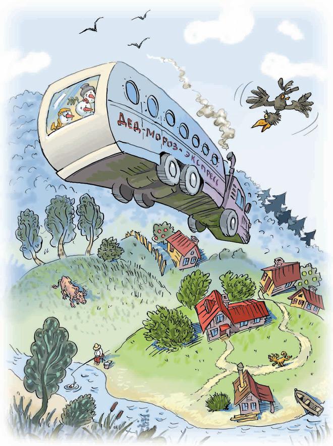Когда трейлер «Дед-мороз-экспресс» вынырнул из облаков, снеговики не сразу заметили родную деревню: дома, и школа, и баня утонули в зелени, виднелись только покатые крыши.