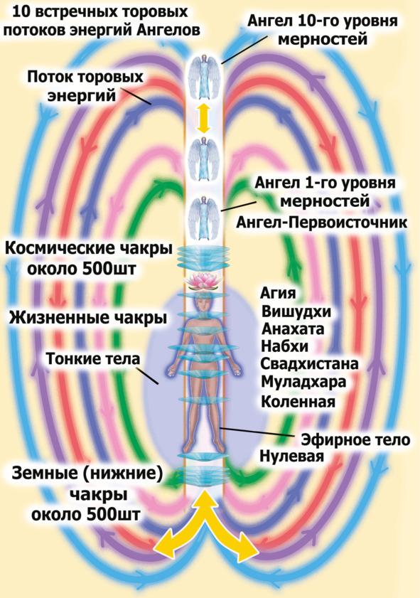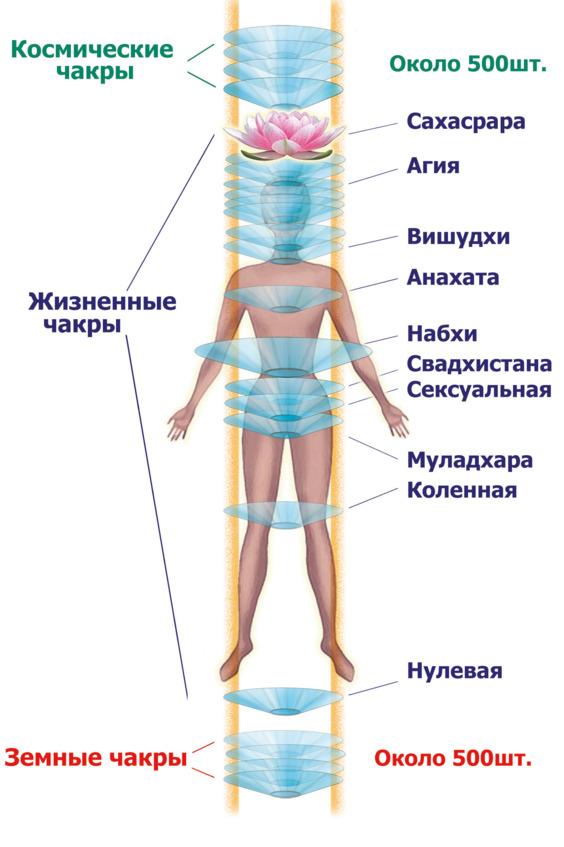 Данная информация значительно отличается от существующих общепринятых понятий о чакрах, однако она проверена на практике. У человека имеется ориентировочно около тысячи чакр, расположенных над человеком, на физическом уровне тела и под человеком. Назовем чакры, расположенные выше Сахасрары, космическими чакрами. Чакры, расположенные рядом с физическим телом, можно назвать жизненными; чакры же, расположенные под человеком, назовём земными или нижними. Они названы так по признаку решаемых ими задач. Каждая чакра всегда работает в двух режимах. Первый режим связан с захватом и фильтрацией энергий Божественного Потока, и доставкой его внутрь энергетической структуры. Второй режим — это режим излучения энергий в пространство.