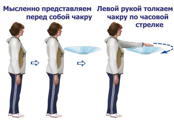 — Берём левой рукой край мысленно воссозданной чакры и толкаем её по часовой стрелке, сопровождая это движение концентрацией своей мысли на этом процессе движения. Для устойчивого воссоздания любой чакры обычно требуется примерно 15 секунд внимания данному процессу.