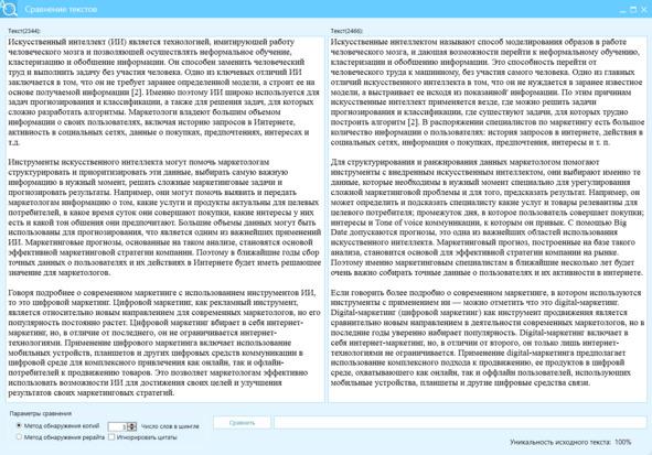 Рисунок 5 — Сверка текста источника (правое окно) с перефразированным текстом (левое окно) по методу шинглов, состоящим их 3 слов, отличие текстов 100%