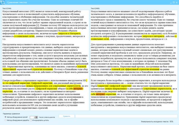 Рисунок 6 — Сверка текста источника (правое окно) с перефразированным текстом (левое окно) по методу шинглов, состоящим их 3 слов, желтым выделены шинглы, которые не изменились, отличие текстов 95%