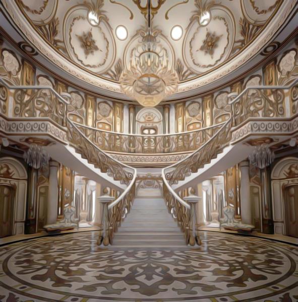 Гигантская дверь, которая была изготовлена из стекла с самыми различными узорами на своей поверхности, открылась и товарищи вошли в зал просто гигантских размеров. Тысячи люстр освещали этот зал, а в центре находилась «царь-люстра». У господина Абдуллаха, явно была страсть к гигантизму. Весь потолок был белого цвета и украшен золотыми линиями и узорами по всему периметру. Частым украшением как на колоннах, так и на стенах были высеченные скульптуры. Среди них была скульптура Дианы Версальской стоящей чуть ниже на уровне одного из балконов, конная статуя Марка Аврелия, скульптура Пирейского льва.