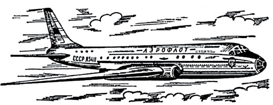 Эти скорости далеко превзошла современная авиация. На многих линиях гражданского воздушного флота СССР работают многоместные лайнеры ТУ-104 и ТУ-114 (рис. 2). Средняя скорость их полета составляет около 800 км/ч.