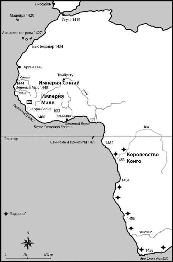 После взятия Сеуты португальцы продолжили плавание на юг вдоль африканского побережья. Около 1420 года они достигли Мадейры, а затем, примерно в 1427 году, — Азорских островов, начав заселение этих безлюдных территорий. Постепенно португальские мореходы продвигались все дальше, в места, не отмеченные ни на одном портулане [2]. Они приближались к «жаркому поясу», где, согласно легендам, морская вода буквально кипела от невыносимой жары. Важной вехой стало преодоление мыса Бохадор на сахарском побережье, известного также как «Мыс страха». В 1434 году Жилу Эанешу удалось войти в «Море тьмы» [3], а в следующем году пересечь тропик Рака. Это стало триумфом человеческого духа над страхом, а также свидетельством высокого мастерства мореходов, которые, в совершенстве овладев искусством использования ветров и течений, смогли благополучно вернуться домой. Папский престол всячески поощрял португальские завоевания, предоставляя участникам походов против мавров, чье присутствие в тех неизведанных краях было хорошо известно, как отпущение грехов, так и полные индульгенции. В 1443 году португальцы основали свою первую факторию на острове Арген у берегов Мавритании. Выбор места был обусловлен наличием источников пресной воды, а также стремлением получить прямой доступ к африканскому золоту, которое уже тогда поступало в Португалию во все возрастающих количествах, что позволило королевству в 1457 году начать чеканку новой монеты — крузадо. Изменение направления торговых путей через Сахару преследовало несколько целей: устранить марокканское посредничество, приблизиться к источникам добычи золота и слоновой кости, а также обеспечить Иберийский полуостров, страдавший от нехватки рабочей силы, невольниками. В 1444 году Нуну Триштан достиг устья реки Сенегал, где впервые вступил в контакт с населением Черной Африки, которую в те времена обобщенно именовали Гвинеей. Именно там португальцы захватили первых африканских пленников, впоследствии проданных в рабство на территории Португалии. Следующей важной вехой стало открытие Сьерра-Леоне, где береговая линия делала поворот к востоку, что породило надежды на возможность обогнуть Африканский континент. Впрочем, мореплаватели вскоре поняли, что обнаружили лишь вход в Гвинейский залив, куда корабли добрались примерно к 1460 году.