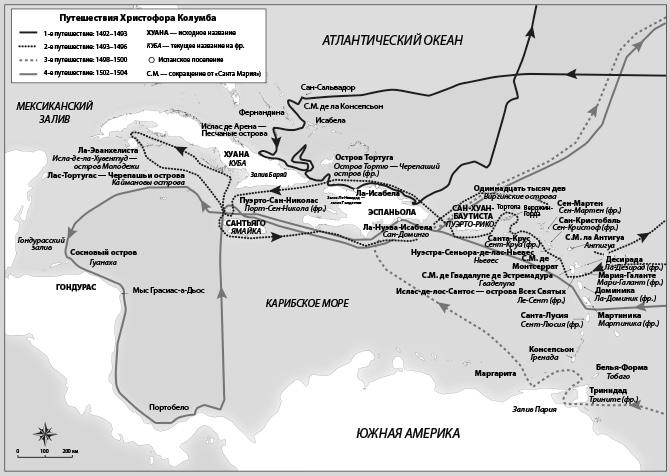 В Изабелле тем временем дела шли все хуже и хуже. Бартоломео, брат адмирала, оказался не в силах обуздать алчность колонистов, которые совершали разбойничьи набеги вглубь острова в поисках золота. Начался безжалостный круговорот насилия над коренными жителями, и поворота вспять уже не было. Колумб, столкнувшись с растущим недовольством и необходимостью оправдать немалые траты на колонию, обложил индейцев непосильной данью золотом. Отныне отношения между испанцами, уступавшими в численности, но обладавшими мощным оружием, и индейцами таино превратились в череду кровавых расправ. Когда в марте 1496 года Колумб вернулся в Европу, стало ясно, что он явно больше преуспел в мореплавании, чем в управлении. Подтверждением тому стали его последующие американские странствия — третье и четвертое (с августа 1498 по октябрь 1500 и с июня 1502 по сентябрь 1504). Летом 1498 года, избрав более южный путь, он достиг берегов Тринидада. Оттуда путешественник исследовал дельту реки Ориноко, после чего, держа курс на запад вдоль венесуэльского побережья, устремился к Эспаньоле. В своем последнем плавании он забрался еще дальше, достигнув Гондураса, а затем, повернув к югу, прошел вдоль берегов до самой Панамы в тщетных поисках западного прохода. Там он повстречал туземцев, напоминавших ему описанных Марко Поло. Для Колумба Антильские острова были лишь преддверием к богатейшим и густонаселенным азиатским землям, но заветные Катай и Сипанго по-прежнему оставались недосягаемыми.