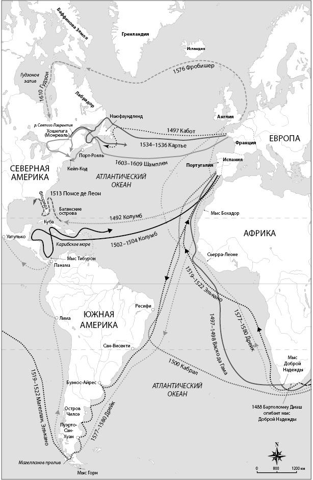 Атлантический мир надлежит понимать прежде всего в его географическом измерении, объединяющем три континента — Европу, Африку и Америку, хотя в американской традиции принято различать Северную и Южную Америку, а следовательно, полагать, что океан омывает четыре материка. Лишь постепенно, на протяжении XV столетия, отважные мореплаватели продвигались в своих странствиях — сначала на юг вдоль африканских берегов, затем на запад в надежде достичь Азии. Но одного лишь достижения далеких земель было недостаточно — требовалось постичь сложную систему ветров и течений. Познание заморских регионов и овладение навигационными условиями позволили европейцам преобразить безбрежность Атлантики, прежде бывшей лишь границей зримого мира, в морскую акваторию, где стали возможны регулярные перемещения. Преграда трансформировалась в фундамент для обменов формирующегося мира, открывавшегося человечеству.