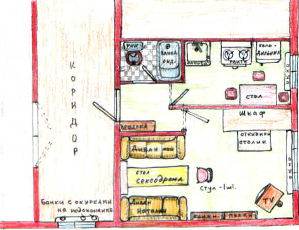 Но главный секрет этого сооружения был в том, что буквально за считанные секунды этот стол можно было убрать в днище некоего подобия матраца, который в «обеденном» положении стоял стоймя прикрепленный к стене в виде большого плоского настенного шкафа. Спрятав стол в этот шкаф, и опустив все это вместе вниз, можно было получить огромную уютную койку, занимавшую все пространство моей «спальной» ниши. Все остальные 8 кв. метров этой 11-ти метровой комнаты оставались бы свободными, и там между возлияниями гости могли бы свободно вальсировать. Такая была задумка. Сохранилась даже план-схема будущего обустройства этой квартирки: