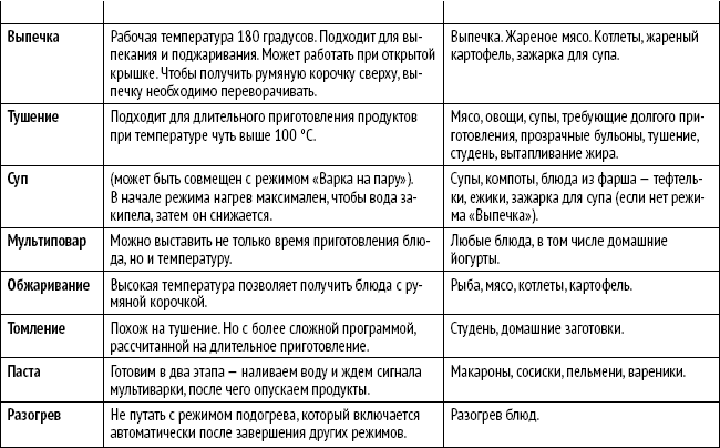 В таблице 1 вы найдете описание самых востребованных режимов мультиварок.