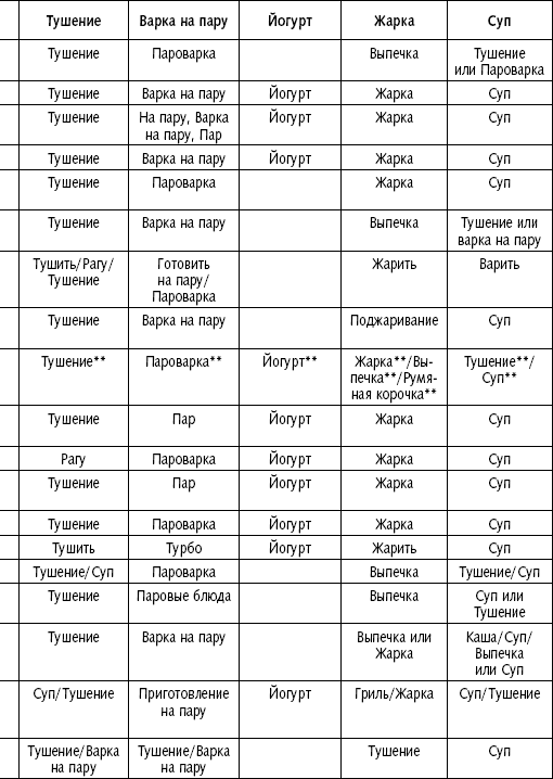 Соответствие режимов разных мультиварок
