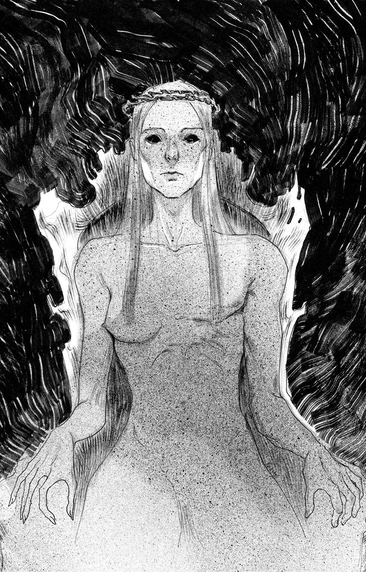 Железная дверь чердака неистово скрипит, а в следующее мгновение в мою комнату влетает дама. С распущенными волосами, бледная, как стена в побелке, в накинутой прямо на голое тело — больше на ней ни клочка одежды — золотой парчовой ткани.