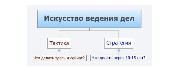 Что такое стратегия? Стратегия — это долгосрочный план действий, основанный на правильно собранной и должным образом проанализированной информации. В отличие от стратегии, тактика основана на принятии решений исходя из настоящей действительности, тогда как стратегия заключается в планировании на далёкую перспективу. Если тактика — это ответ на вопрос «Что делать здесь и сейчас?», то стратегия — это ответ на вопрос «В какой точке мы окажемся через 10—15 лет и что делать, чтобы оказаться именно в той точке, которую мы наметили?».