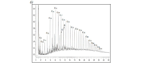 Углеводородный состав битумов изучали методом высокотемпературной ГЖХ с использованием хроматографа фирмы PerkinElmer с ПИД в режиме программирования температуры 20–360º С [38].
