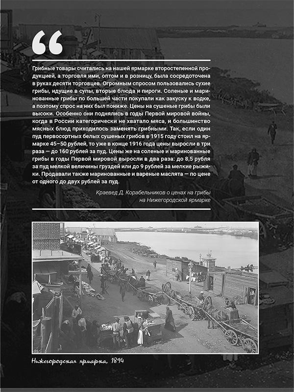 «Прежде чем говорить о торговле грибами в Петербурге, скажем несколько слов о грибном деле в России вообще. Следует заметить, что в тех странах, где народ по своему вероисповеданию не обязан соблюдать постов (например, лютеране, реформаты и другие), знание грибов очень мало распространено в народе; главными же знатоками и потребителями грибов являются народы православного и католического исповедания, у которых, по обрядам их религий, полагаются посты.
