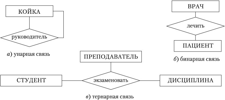 Степень связи— это количество типов сущностей, которые входят в связь. Различают унарные (рис.1.5, а), бинарные (рис.1.5, б) и тернарные (рис.1.5, в) связи. (На практике связи с большей степенью редко используются). Унарная связь означает, что одни экземпляры сущности связаны с другими экземплярами этой же сущности (например, одни сотрудники руководят другими, адеталь может являться частью механизма).
