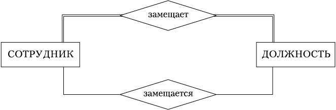 Между сущностями ПрО могут существовать связи, имеющие различный содержательный смысл (семантику). Например, студент учится в группе, врач лечит пациента, клиент имеет вклад в банке. Связи могут быть факультативными или обязательными. Если вновь порождённая сущность одного из типов оказывается по необходимости связанной с сущностью другого типа, то между этими типами сущностей есть обязательная связь. Впротивном случае связь является факультативной. Примеры обязательной ифакультативной связей приведены на рис.1.3. Здесь связь замещает является обязательной (изображается двойной линией), потому что каждый сотрудник должен работать на определённой должности, а связь замещается является факультативной, поскольку должность может быть вакантна.