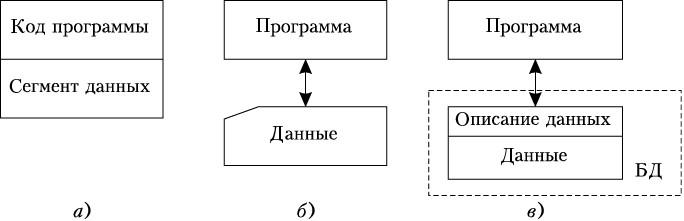 На заре развития вычислительной техники обрабатываемые данные являлись частью программ: они располагались сразу за кодом программы втак называемом сегменте данных (рис.1.1, а). Следующим шагом стало хранение данных в отдельных файлах (рис.1.1, б). Недостатком этих подходов являлась зависимость программ от данных: сведения о структуре данных включались в код программы. При изменении структуры данных необходимо было вносить изменения в программу.