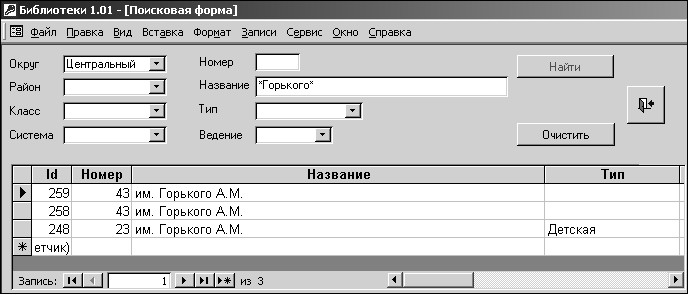 Информационный язык ИПС предназначен для того, чтобы пользователь мог запросить данные у системы. Системными средствами пользовательский запрос преобразуется в формальный запрос, понятный системе. Информационный язык ИПС может быть основан на подмножестве естественного языка, которое относится к обслуживаемой ПрО. Но чаще поиск документа осуществляется с помощью шаблонов— экранных форм, включающих поля описания документа. В эти поля вносятся конкретные значения, которые и определяют условия поиска документов. На рис.1.2 приведён пример поиска через экранную форму в справочнике библиотек. В форме указаны два условия— округ и фрагмент названия библиотеки, и в результате поиска система выдала три записи, удовлетворяющие этим условиям.