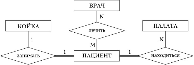 • пациент—врач (n:m) — каждый пациент может лечиться у нескольких врачей, каждый врач может лечить несколько пациентов.