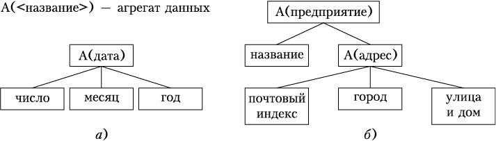 Агрегат данных— поименованная совокупность элементов данных внутри записи, которую можно рассматривать как единое целое. Агрегат может быть простым (включающим только элементы данных, рис.2.2, а) исоставным (включающим наряду с элементами данных и другие агрегаты, рис.2.2, б).