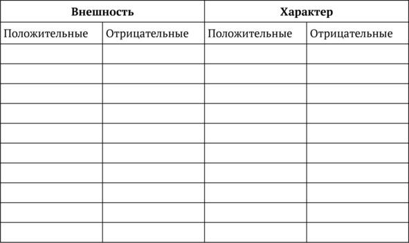 Опишите свою внешность используя минимум 10 прилагательных как положительных так и отрицательных. Тоже самое проделайте и с качествами характера. Напишите свои 10 положительных и 10 отрицательных качеств. После, над плюсами можно улыбнуться и порадоваться, какая вы классная, а как поработать над минусами ищите на следующей странице.