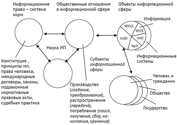 Структуру информационной сферы как предмета права составляет классическая «триада»: объекты, субъекты и отношения, которые возникают у субъектов по поводу объектов информационной сферы, а также наука информационного права (изучающая закономерности развития этих отношений и их отражение в правотворчестве, правоприменении и развитии правосознания) и информационная культура.