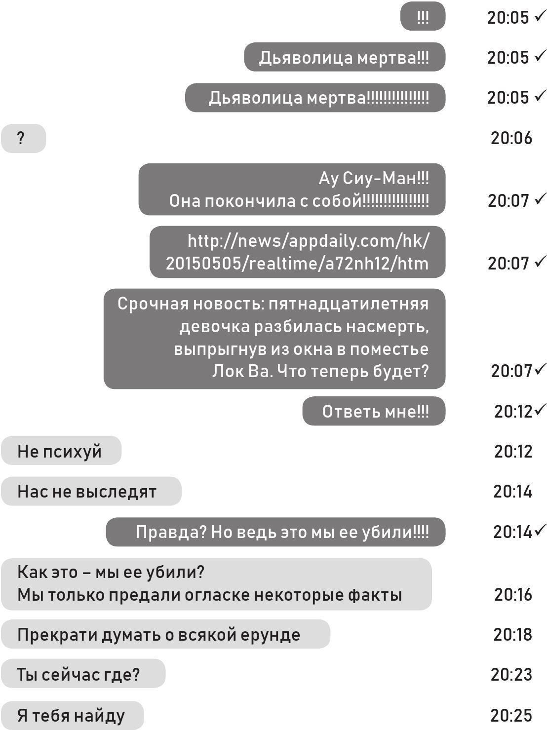 Нга-Йи быстро рассказала о случившемся – как Сиу-Ман стала жертвой извращенца в поезде, как ее обидчик неожиданно признал себя виновным, потом – о клеветническом посте в чате «Попкорн», о травле в Интернете, бесчинствах прес