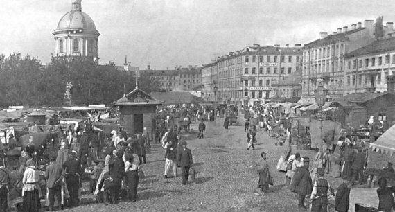 Чем дальше от Театральной площади уходила Офицерская улица, тем больше становилось магазинов помельче – лавок и лавчонок. В них часто совсем не было приказчиков, хозяин со всем семейством жил при магазине. Над входной дверью подобного торгового заведения висел колокольчик, который давал владельцу знак о приходе покупателя. Подобные торговые заведения особенно часто встречались на улице после ее пересечения с Крюковым каналом, в районе Коломны. Особый вид имели так называемые мелочные лавки, прототипы современных универсамов и супермаркетов. В них можно было приобрести хлеб, селедку, овощи, крупы, конфеты, мыло, керосин, швабру, метлу, почтовые открытки, конверты и марки к ним, лампадное, постное, сливочное и топленое масло, дешевую посуду, пироги с различной начинкой, мясные продукты, предметы одежды и постельное белье, кнуты для извозчиков и предметы лошадиной сбруи. Всего не перечесть. При некоторых лавках существовали небольшие пекарни, там кроме хлебобулочных изделий по просьбе покупателей можно было запечь ароматный окорок или баранью ногу, нашпигованную чесноком, к рождественскому или пасхальному праздничному столу.