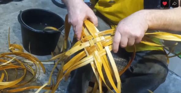 Колодочку из десяти лычек лыковых липовых начинаем заплетать с коврика 4х4 затем определяем ширину носочка берём две или три лычки спереди и перегибаем их на наши парные лычки оставшиеся лычки которые идут вперёд заплетаем на 180° возвращаем мы их обратно в наше плетение у нас получается носочек и четыре пар справа и пять пар слева затем мы делаем бортик справа и слева переплетая снизу четыре лычки вверх в шахматном порядке через все лычки Таким образом мы доходим до пяточки на пяточки мы берём третью лычку и обнимаем вторую и завязываем пяточку за третий лычкой А мы проплетаем справа и слева четвёртую и пятую у нас поднимается вверх и все 16 лычек которые у нас в наличии мы разбиваем на четвёрки две четвёрки на пяточки и две четвёрки на носке затем на пятки опять берём третью лычку и обнимаем вторую как бы на нашем голенище и заворачиваем его обратно в сторону носка опять после третьей берём четвёртую и и у нас все лычки разбиваются по четвёркам то есть две четвёрки с носка две четвёрки с пятки они идут навстречу друг другу и вплетаются в свои парные строчки и колодочка становится замкнутая и бесконечная что нам и требуется внутрь можно засунуть ветошь вот наша колодочка и готова она повторяет форму лаптя по ней очень удобно закреплять короткие лычки!