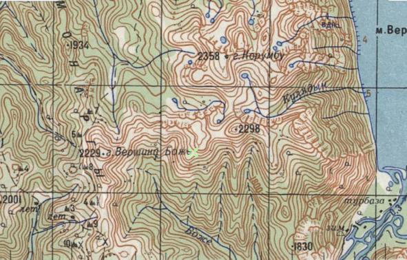 Обратимся к документам, посмотрим на географическую карту. Почти вдоль Телецкого озера от мыса Куван до озера Коккель тянется хребет Алтынту. Он упирается в Самультинский хребет. (Написание названий по топографической карте горной части Алтая 1992 года.) Главные вершины хребта находятся в верховье р. Пыжа и р. Сынырлу. Почти все вершины безымянные, кроме горы Мажату (2036 м) в верховье р. Аспары. По этой реке можно выйти к р. Большие Чили. И по р. Ниж. Талдукел или по р. Аба тропа выведет на небольшой хребет, притянувшийся от р. Бол. Чили до р. Ачелман — это хребет Монаргы. Его главная гора Вершине Боже (2229 м), от нее строго на восток будет точка, отмеченная на картах высотой 2298 м. Именно эту вершину называют Алтын-ту. На север от нее гора Корумбу (2358 м). Давно измерено, что Корумбу на 500 м дальше от бега Телецкого озера, чем Алтын-ту.
