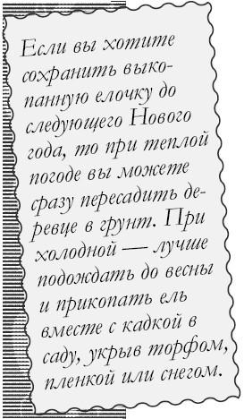• Если вы проживаете в своем доме, а в вашем саду растет небольшая елочка – на Новый год ее можно забрать в дом. Для этого деревце за несколько дней до праздника пересаживают в просторную емкость, корни обильно смачивают водой, обворачивают в синтетическую пленку и присыпают мхом или торфом. Но не стоит сразу же переносить елочку в теплое помещение – она может погибнуть. Сначала поместите ее в светлое, прохладное помещение, а некоторое время спустя (за день до праздника) внесите в отапливаемое помещение. Таким образом вам удастся избежать резкого перепада температур.