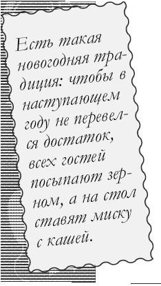 Чтобы в наступающем году не перевелся достаток – всех гостей посыпают зерном, а на стол ставят миску с кашей. К столу можно также подавать все, что символизирует достаток и богатство: зерна, ягоды, орехи. Можно украсить подобными символами и всю квартиру.