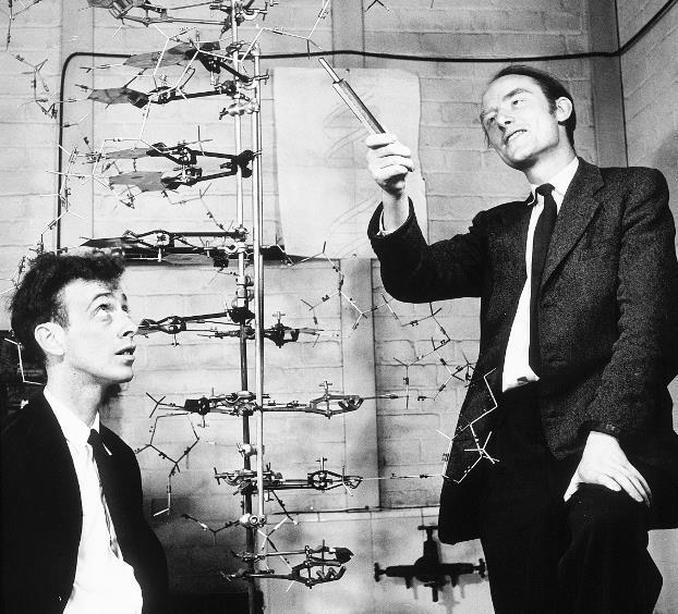 Лауреаты Нобелевской премии Джеймс Уотсон (слева) и Фрэнсис Крик (справа) вывели молекулярную структуру ДНК на базе работ рентгеновских кристаллографов Мориса Уилкинса и Розалинд Франклин.