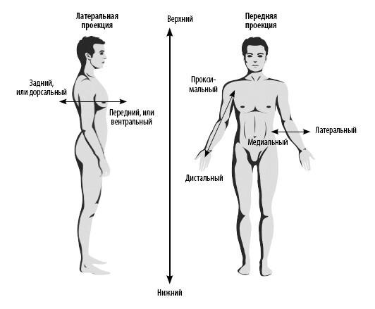 Под анатомическим, или стандартным, расположением понимают такое положение тела, при котором человек стоит прямо, лицо обращено вперед, руки опущены, предплечья супинированы (пальцы выпрямлены, ладони открыты и обращены вперед, большой палец каждой руки смотрит вбок). Если ладонь обращена назад, а большой палец смотрит в сторону тела, то такое положение предплечья называется пронированным. Все описания топографического расположения структур в организме приведены по отношению к стандартному положению. Это контрольная точка, помогающая медицинским специалистам лучше ориентироваться в нашем теле.