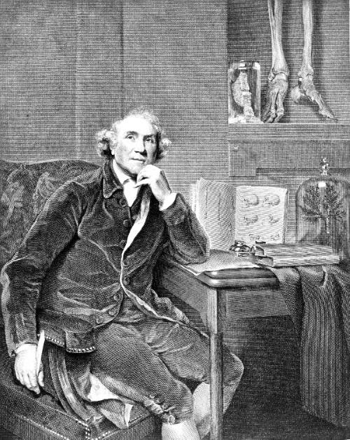 Анатом Джон Хантер рядом со скелетом (ногами) «ирландского гиганта» Чарльза Бирна. Экспонат выставлялся против посмертной воли самого Бирна